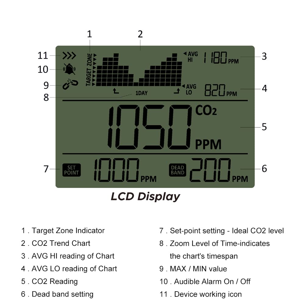 -Μεγάλη LCD οθόνη -Ενσωματωμένος αισθητήρας ημέρας/νύχτας -Αισθητήρας Low Drift NDIR -Γράφημα με μεταβλητό χρόνο Zoom Levels -Βαθμονόμηση αισθητήρα ανεξάρτητα